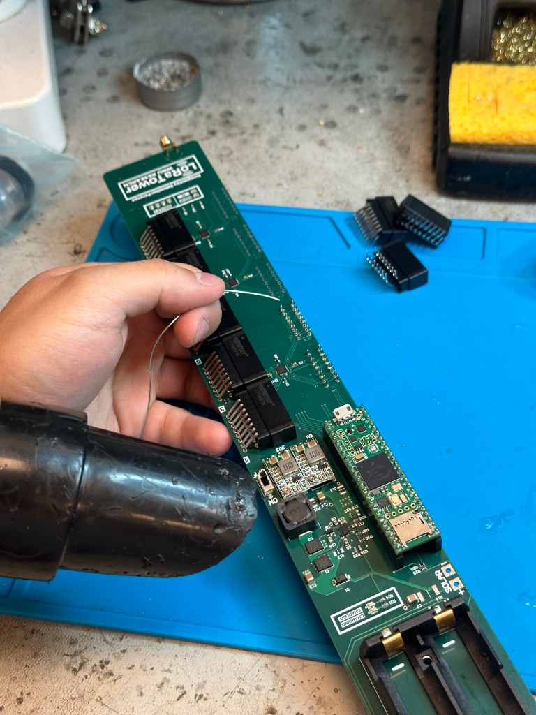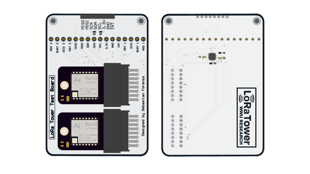 My first task was to make small PCBs that had the 433mHz LoRa module on them, along with a few capacitors, as seen in the first image. These PCBs will later be inserted to the main tower, this method allows the user to insert as many of these modules as they please (up to 10) when setting up the tower. Adding more modules allows for a larger bandwidth for the tower. This also allows for hot swapping of radios incase one fails or if it needs to be quickly removed.