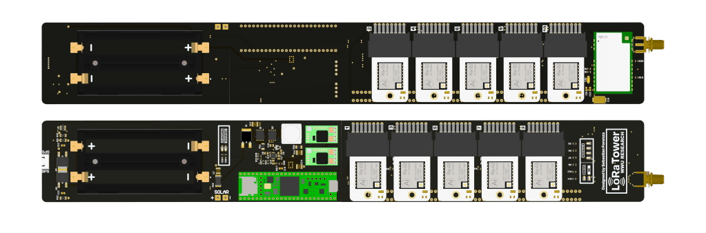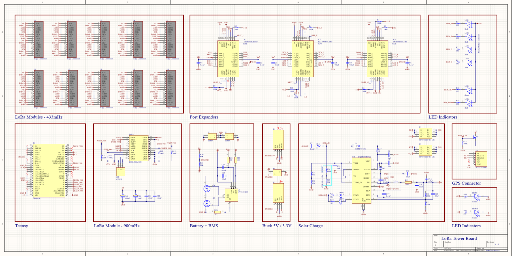 I am really proud of this board, this took me a long time and it came out great. This board holds basically every single part that the tower needs to work (minus the GPS, solar panel and antennas, those have to be separated because of EMI). This board is packed with features, it has 4 battery holders for 18650 cells, along with a 2s BMS to protect the cells from over charging and over discharging. To actually charge the batteries, all that is needed is a solar panel that wires directly to the board. The Solar MPPT circuit on the board gets the most possible power out of the solar panel and then charges the battery pack to 8.4 volts. The battery pack is then wired to two buck converters, a 5V and 3.3V step down. The 5v buck converter powers the Arduino Teensy 4.1, the 900mHz 1W LoRa module, and the GPS. The 3.3v buck converter powers the 10 433mHz LoRa modules, and the port expanders. Antennas can then be hooked up to the LoRa modules and the coax cable at the bottom of the board. All of this fits inside a 2 inch tube, that can then be fixed to a tree, another tower, or the top of a building.