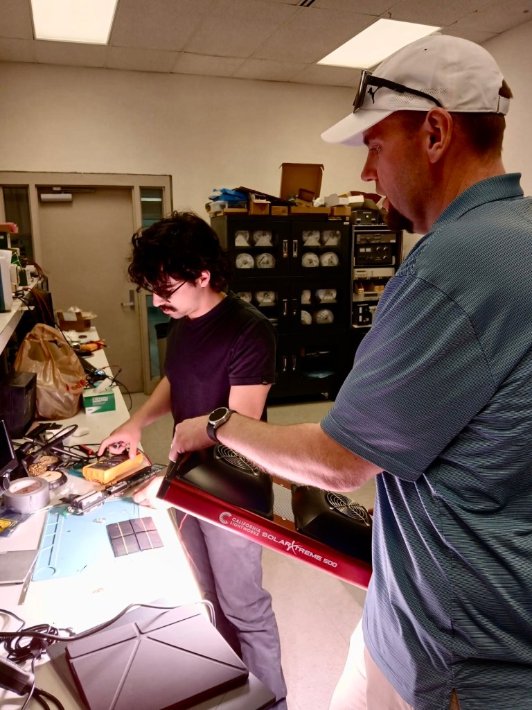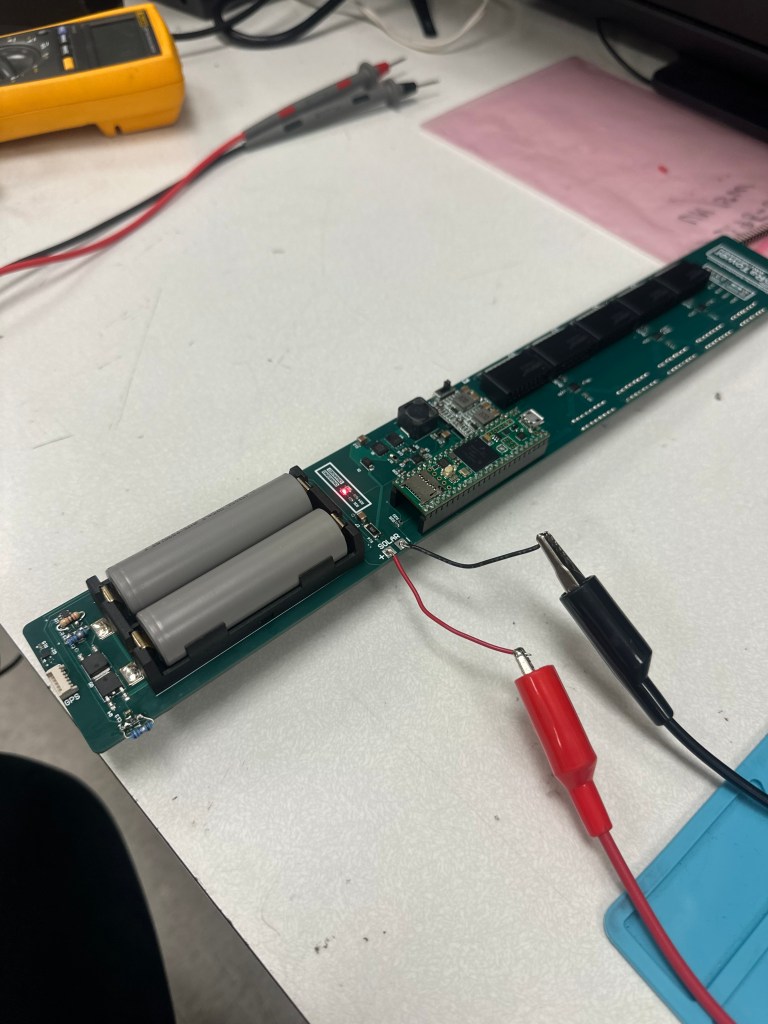After fully assembling the board, I hooked up the board to a bench power supply to test and see if the solar charge circuit would start charging the cells. To my surprise, the IC I used for the solar charge circuit would not accept a constant voltage from the power supply, it was too smart for that. Instead I rigged up a few solar panels that were laying around the lab, and powered them with a 400W light panel. Once we did that we started to see the circuit accept the power and charge the cells. My professor later tested the circuit with a proper 60W panel and saw better results.