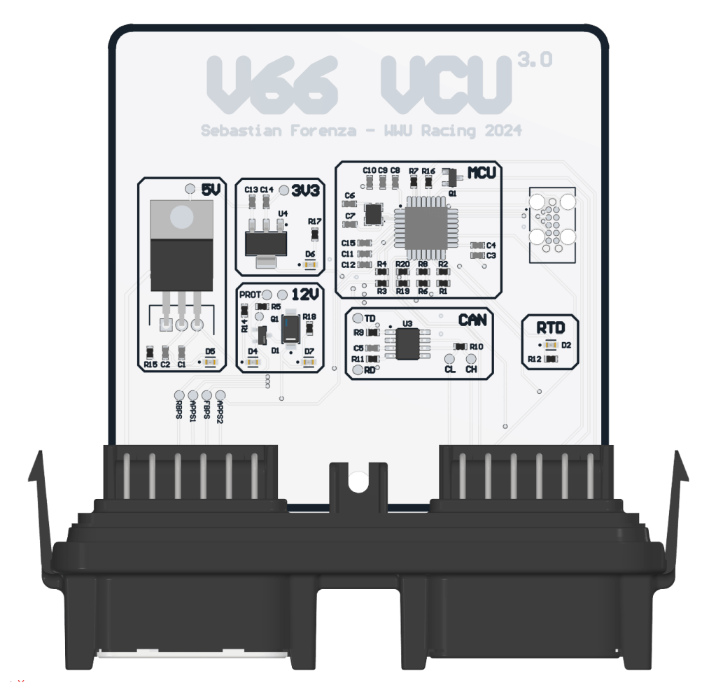 In this new version, the VCU went through a lot of changes. I put the STM32 MCU on the board itself instead of the entire development board, this makes it look more professional and makes for a more complete product. This board also has a proper Deutsch connector on it, making more a more secure connection that will last a lot longer. I also grouped all of the sections of the board into boxes and added indicator LEDs for most boxes to better see if the system is working properly. Along with organization, I added test points all over the circuit so problems could better be diagnosed and save time when testing the board. These changes help new members get a better understanding of the circuit, which allows them to learn faster about the system and make for well-informed teammates.